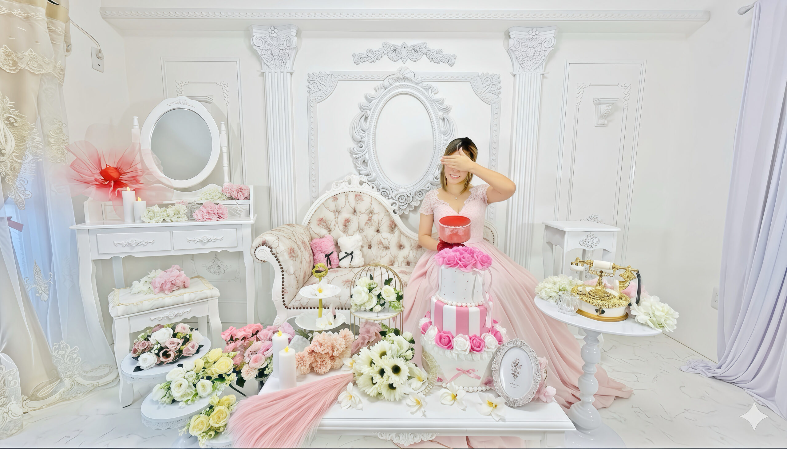 エレベータ完備のため荷物が多くても問題なくお使いいただけます。ロココ調、エレガンス調、アンティーク調、プリンセス風、姫系、ゆめかわ系、ゴスロリなどの撮影シーンに人気です。ニューボーンフォト、モデル撮影、推し活、本人不在の生誕祭、祭壇撮影、グッズ撮影、記念撮影、バースデーフォト、宣材写真、商品撮影、コスプレ撮影、ポートレート撮影、動画撮影、マタニティーフォト、ウェディングフォト(ブライダルフォト)、TikTok撮影、YouTube撮影、控室など幅広い用途でお使いいただけます。北九州市内で可愛い格安スタジオをお探しなら、ぜひ姫スタジオをご検討下さい。