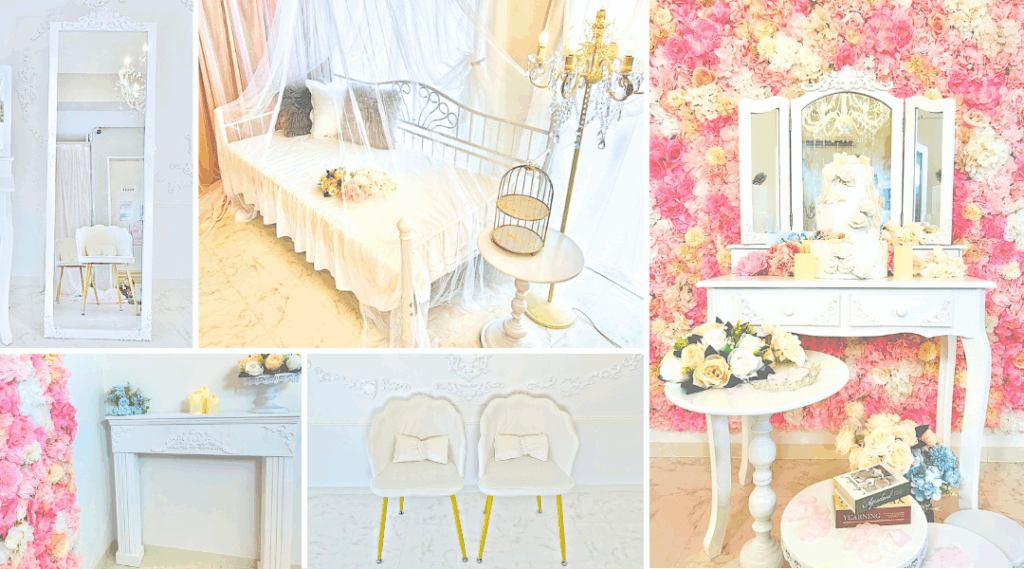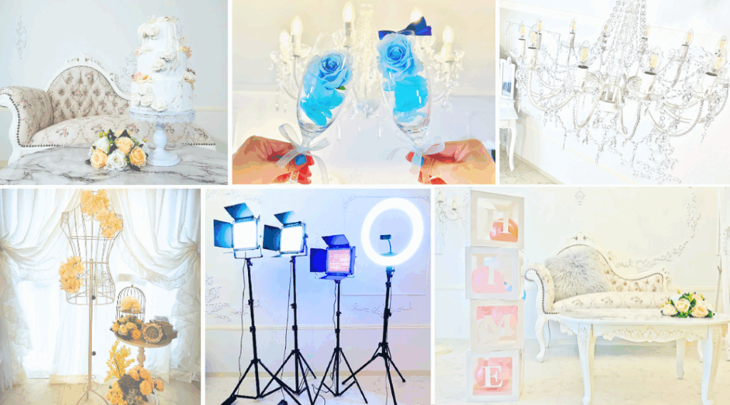 - 3つの背景(メイン白壁、フラワー壁、天蓋ベッド)で自由に撮影。
